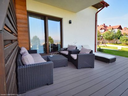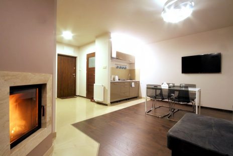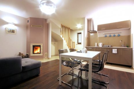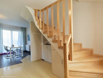 Apartament dwupoziomowy składa się na parterze z pokoju dzienno-sypialnianego oraz eleganckiej łazienki z prysznicem. Pomieszczenie to oprócz aneksu kuchennego oraz stołu jadalnianego wyposażone jest w telewizor z płaskim ekranem, kominek oraz rozkładaną sofą jako miejsce do spania dla dwóch osób. W aneksie kuchennym znajdziemy zmywarkę do naczyń do której zapewniamy tabletki, kuchenkę mikrofalową z funkcja grillowania, mini lodówkę 60 litrów, płytę kuchenną, talerze, garnki, sztućce, wszelkiego rodzaju szklanki, kieliszki, kubki jak również, ręczniki papierowe, kawę, herbatę i cukier. Z poziomu parteru jest wyjście na prywatny taras gdzie każdy znajdzie swój komplet mebli wypoczynkowych składający się z kanapy, dwóch foteli, stolika oraz leżaka. Łącznie posiadamy 4 apartamenty dwupoziomowe.